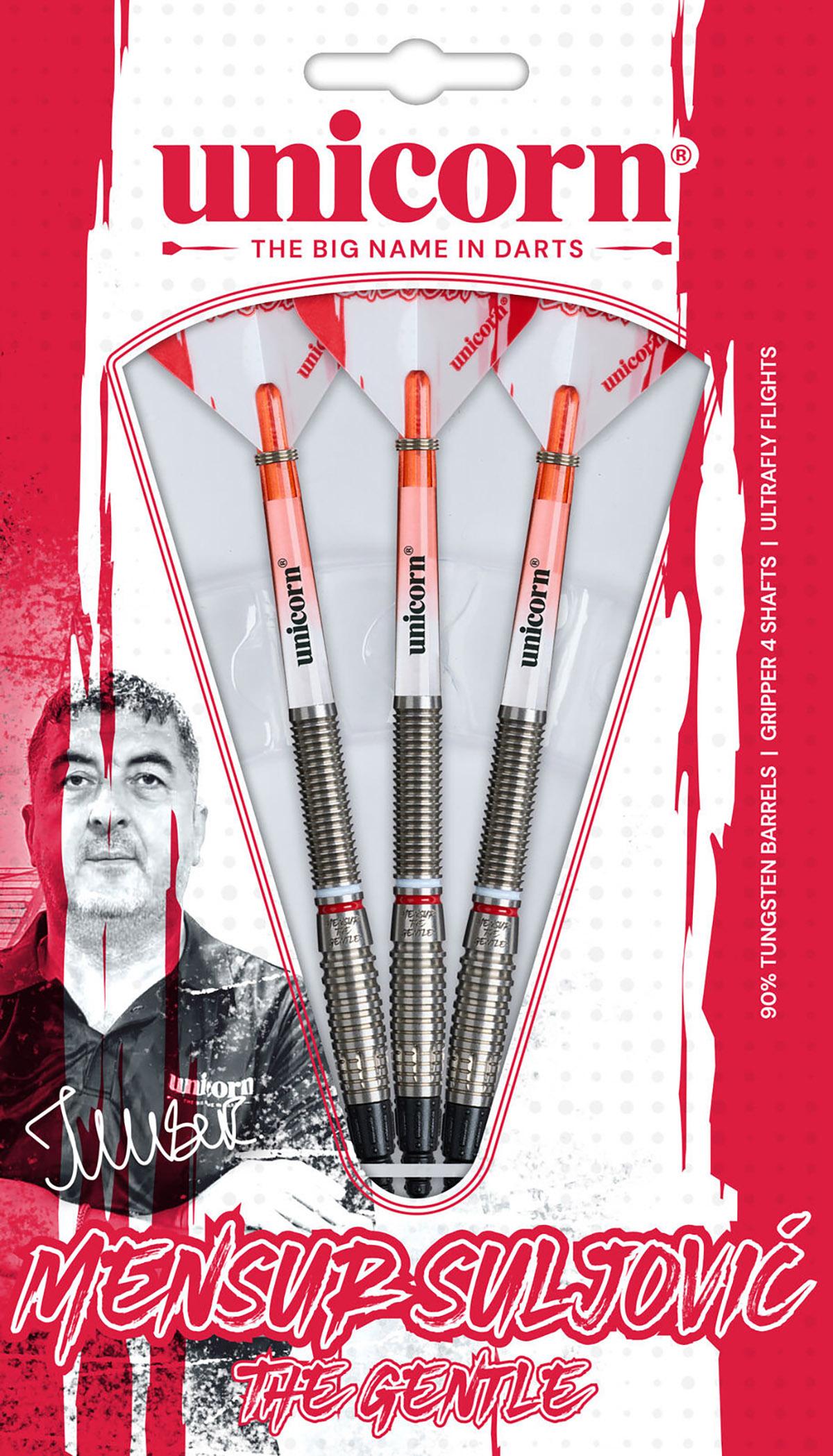 The Mensur Suljovic darts are 95% Tungsten barrels, finished with The Gentle logo and red and white stripes - a nod to his Austrian heritage. The barrels are complimented by the Gripper 4 White shafts, Mensur's new Ultrafly flight and Unicorn's Epic soft tips.