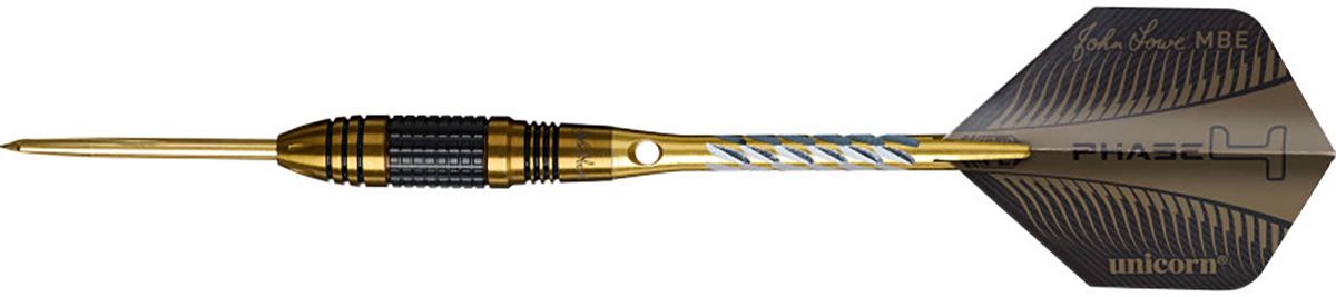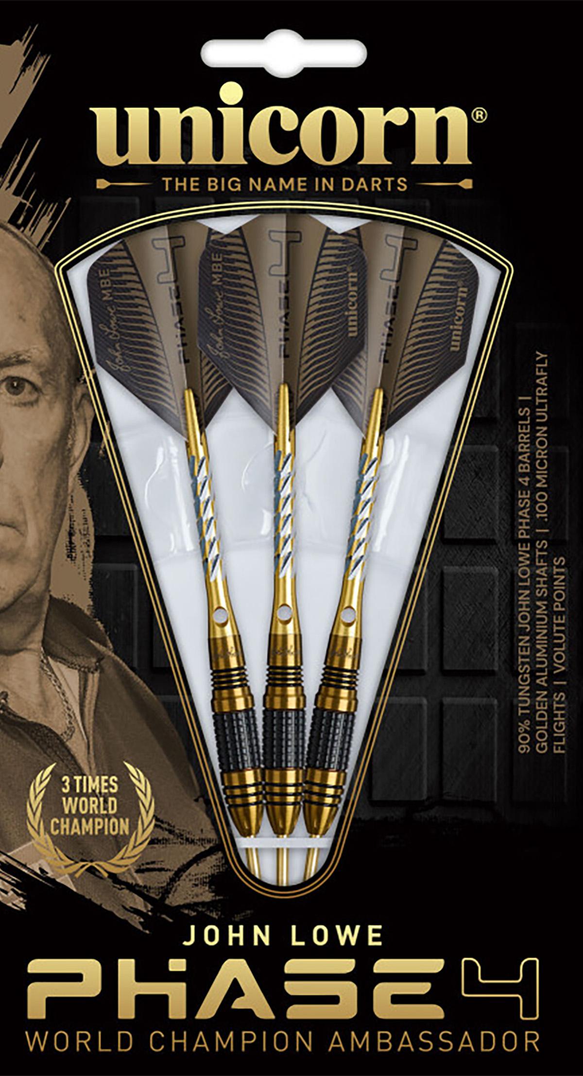 Created in collaboration with the legendary three-time World Champion, the revamped 90% tungsten barrel is fine-tuned to deliver John’s unerring accuracy and controlled playing style that saw him dominate the sport. Updates include a centrally positioned milled micro block to provide more grip and an enhanced feel for improved control. His iconic ‘bomb’ profile boosts flight speed, ensuring exceptional precision on your throws. Finished in a celebratory gold PVD coating that reflects his illustrious status, the barrel is paired with gold Premier Aluminium shafts to embody John’s prestige. Patented Volute® points in a gold finish deliver superior sisal grip and extend dartboard life.