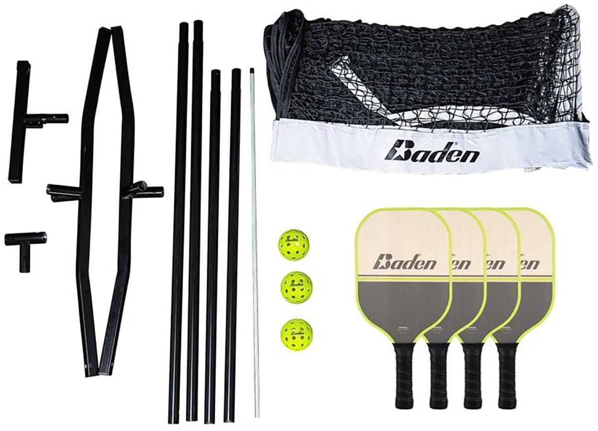 Set Includes: One Full-size net, four wooden pickleball paddles, three official size and weight pickleballs, carrying bag, set-up and game-play instructions.